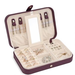 V-LAFUY Jewelry Travel Organizer, Travel Jewelry Box Portable, Small Travel Jewelry Case with Mirror, PU Leather Small Jewelry Box for Women, Burgundy Red A