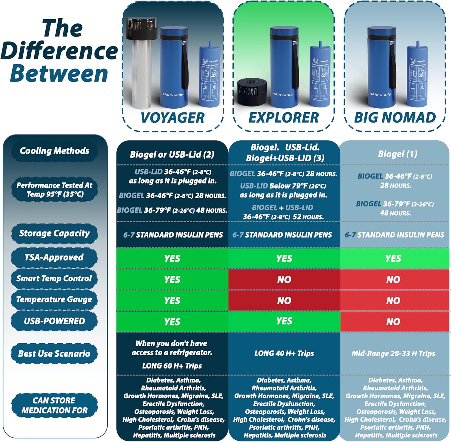 - FLEXIBLE 3-IN-1 COOLING OPTIONS: The Explorer medication travel case uses USB power, a Biogel ice pack, or both combined for extended performance; enjoy up to 52 hours of refrigeration and 72 hours of cooling below 79°F, suitable for off-grid travel