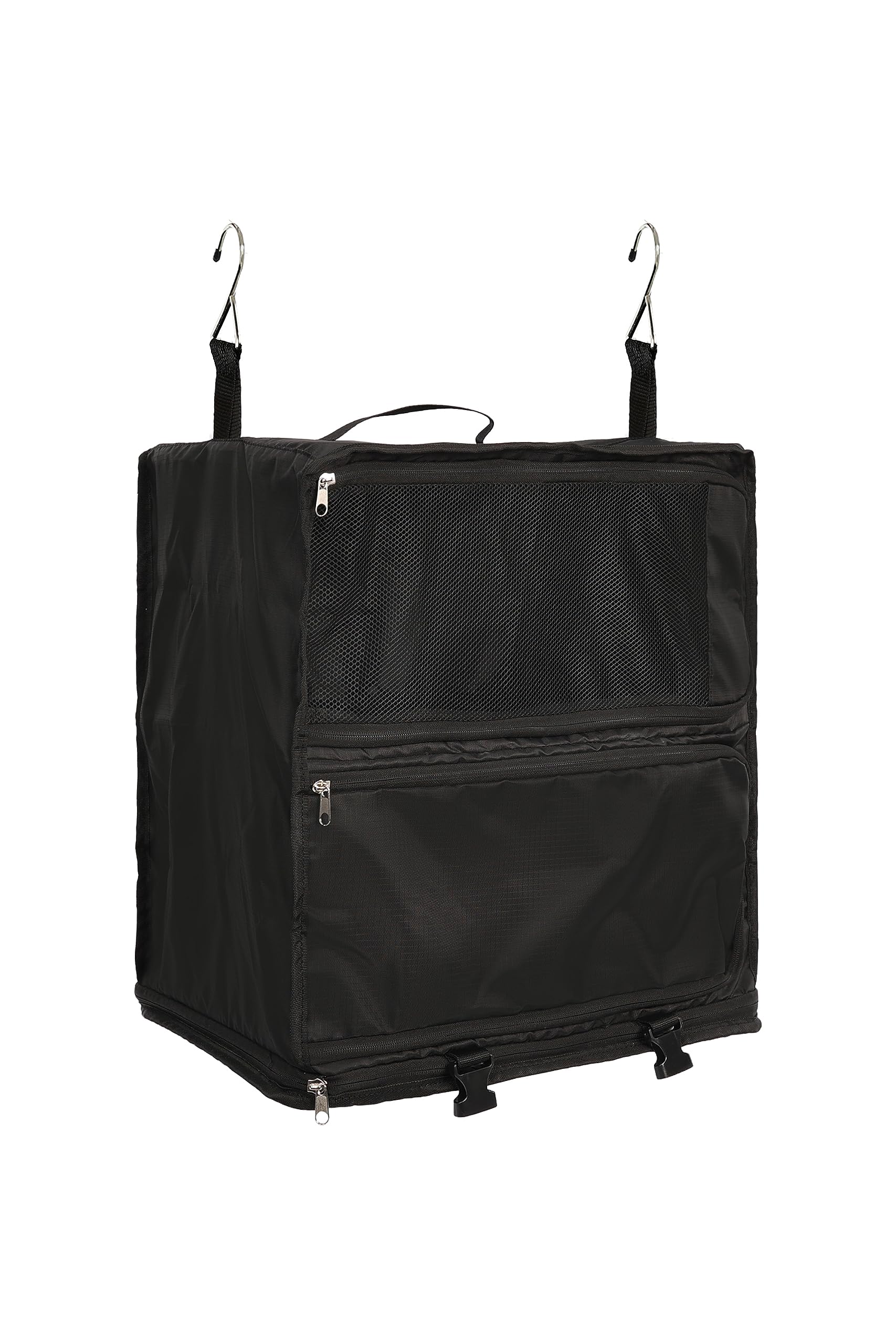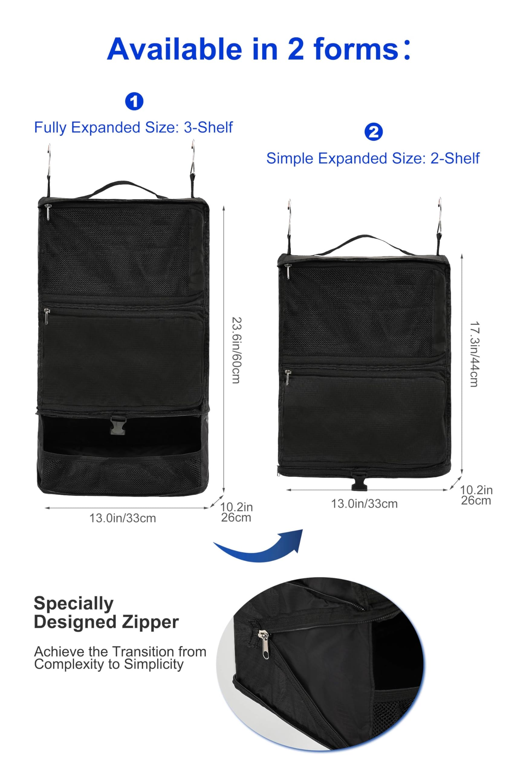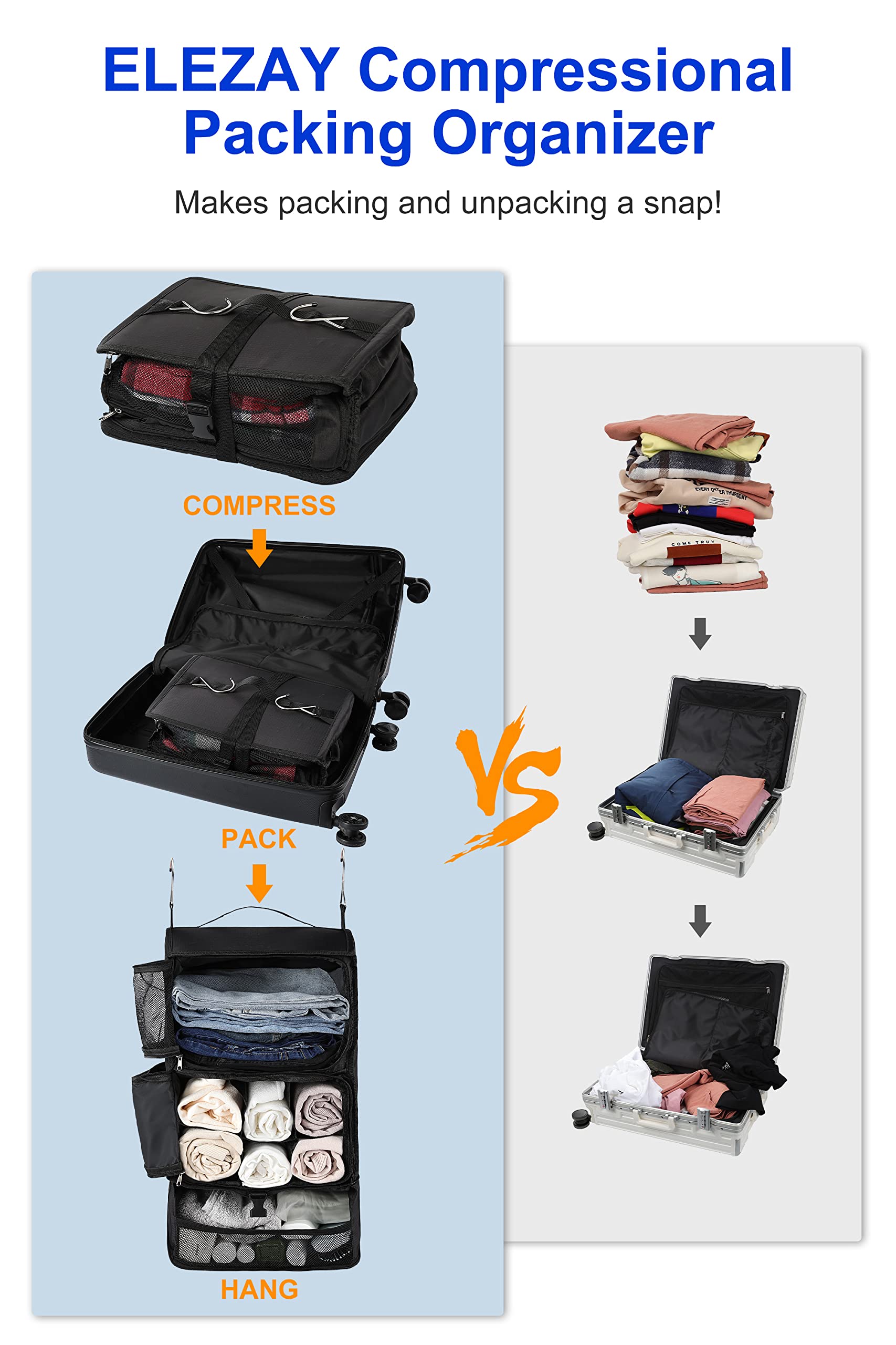 - [Match Needs with Possibilities] – With ELEZAY hanging packing organizer, you can get both a portable closet and a packing cube: the hanging shape for wardrobes; the compression shape for space saving by the buckle+adjustable binding strap. All you need to do is pack, compress, and buckle the collapsible storage bag, put it in the carry-on luggage, and hang it in the hotel closet, no more digging for clothes.