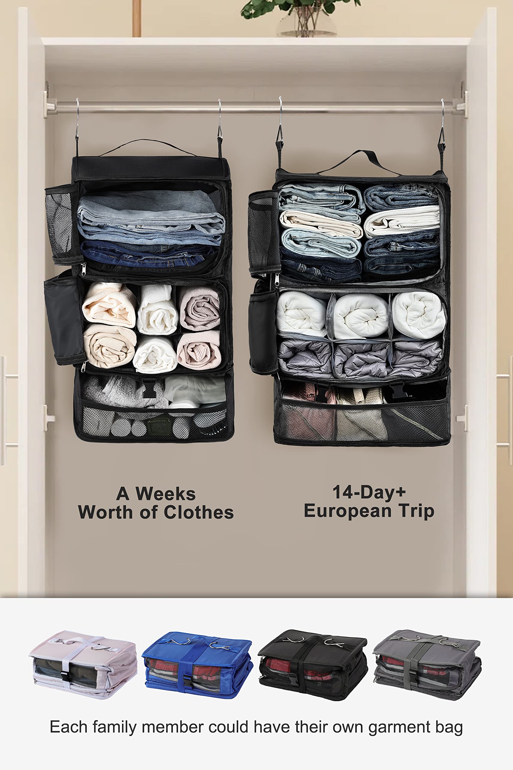 - [Stay Organized] – Portable Hanging Shelf (No Side Pockets) allows you to pack and unpack effortlessly, making your trip less tumultuous and more enjoyable. With different colors for family vacations, everyone could own a travel garment bag. If you are planning a summer holiday, size#Large could be suitable for a week’s worth of clothes and #X-Large ones may be ideal for longer trips. One luggage organizer bag is all you need to meet your multiple packing needs.