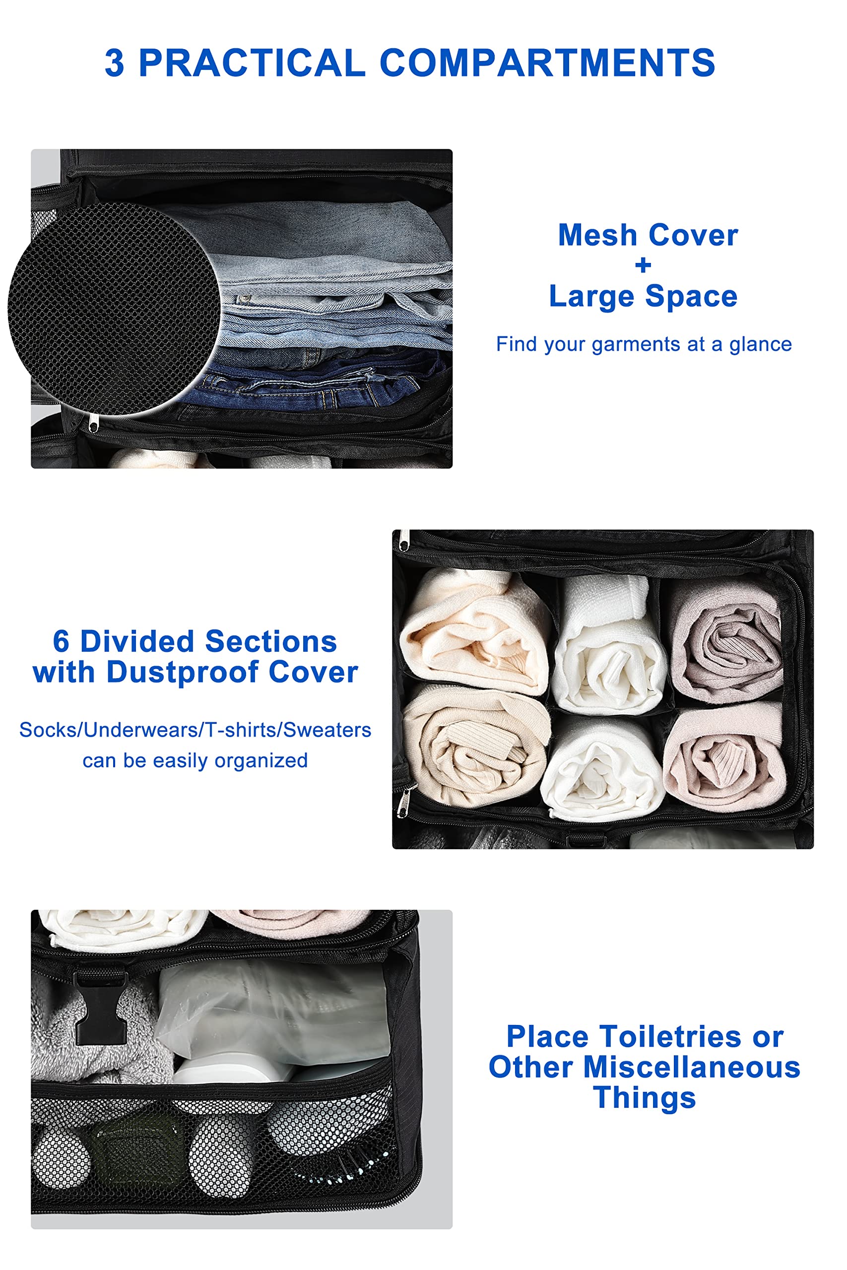 - [Less Mess and Easy Access] – Three divided compartments for different clothes: 1. Ample space & zippered mesh cover – find your clothes at a glance; 2. Six socks/underwears/T-shirts/sweaters/towel dividers with zippered cover; 3. Collapsible toiletries storage with the elastic barrier: most of your travel essentials like electric toothbrushes/ mouthwash/ slippers and other miscellaneous things can be well placed.