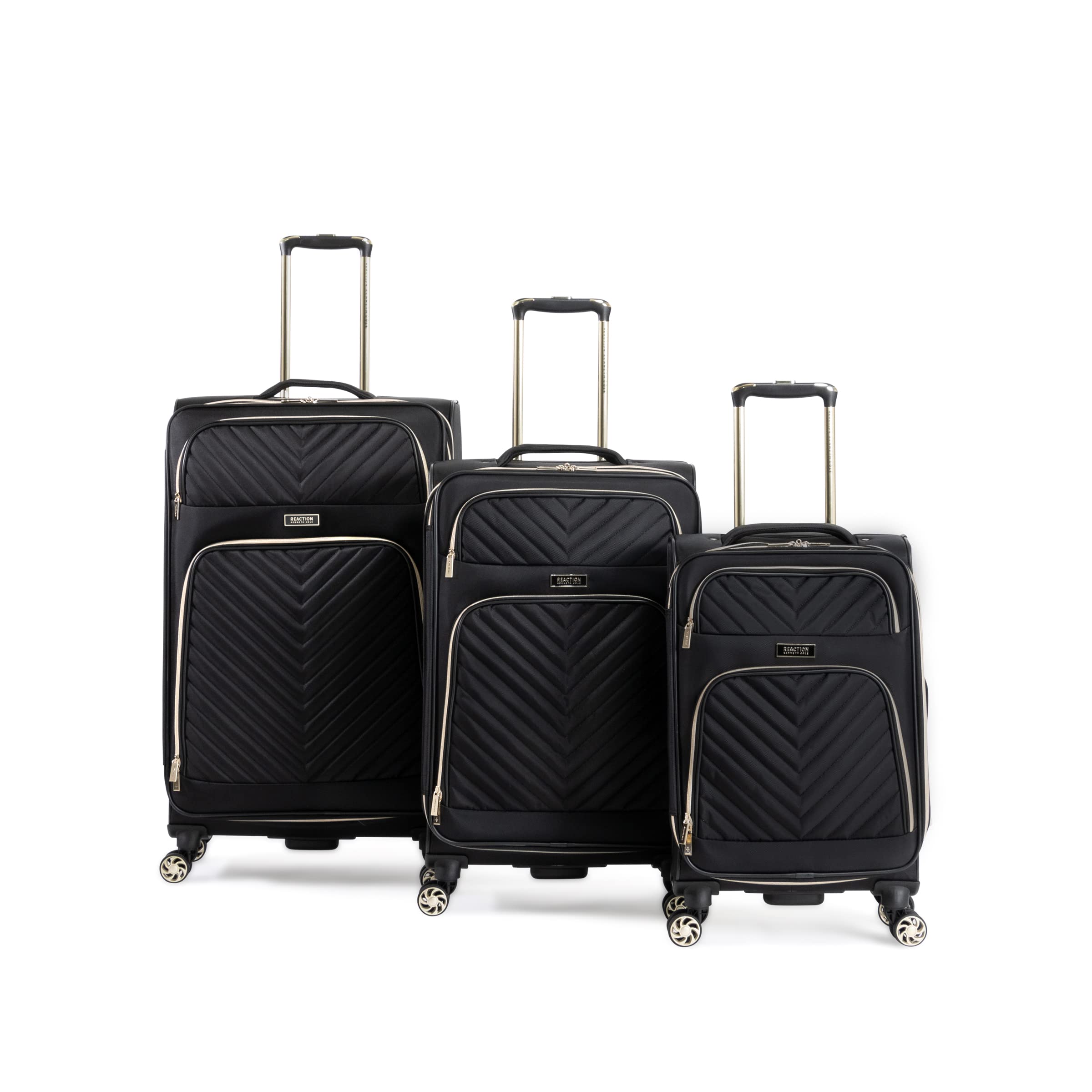 Details: Finally, travel made trendy with the stylish polyester-twill chevron luggage from Kenneth Cole Reaction’s Chelsea luggage collection. Complete with a fully lined, tear-resistant interior, this luggage also expands an additional 2. 0 inches, ensuring that you have plenty of space for all your needed belongings. Its lightweight construction helps you meet airline weight restrictions to avoid unnecessary airport fees, while its 8-wheel spinners provide effortless 360-degree navigation allowing you to glide quickly through the airport. The main compartment interior features a hanging side zipper pocket and garment restraints to hold belongings in place. The under-the-lid section includes a mesh zipper pocket and a transparent, clear PEVA gusseted pocket for toiletries. The front exterior also features a small zipper pocket for easily accessible items and a large gusseted zipper pocket for additional storage organization. Padded top and side handles allow for easy maneuvering, and a bottom grab handle allows for easier lifting. Additionally, a retractable trolley handle extends to be 41 inches tall with a locking push button mechanism. Fashionable and functional, Chelsea luggage also boasts fashion-forward gold hardware with premium self-repairing coil zippers designed for long-lasting use. Carry-on size meets most U. S. based airline carry-on size requirements and fits into most airline overhead bin compartments. Backed by a manufacturer 10-year limited . ★ 20” Carry-On Overall Dimensions: 22. 0” H” x 14. 0” L x 9. 0”-11. 0” D. ★ 20” Carry-On Packing Dimensions: 20. 0” H x 13. 5” L x 8. 5”-10. 5” D. ★ 20” Carry-On Weight: 6. 35 lbs. ★ 24” Checked Overall Dimensions: 27. 0” H x 15. 0” L x 10. 0”-11. 5” D. ★ 24” Checked Packing Dimensions: 24. 0” H x 14. 5” L x 9. 5”-11. 0” D. ★ 24” Checked Weight: 8. 4 lbs. ★ 28” Checked Overall Dimensions: 29. 5” H x 16. 0” L x 11. 0”-12. 5” D. ★ 28” Checked Packing Dimensions: 28. 0” H x 15. 5” L x 10. 5”-12. 0” D. ★ 28” Checked Weight: 10. 0 lbs. ★