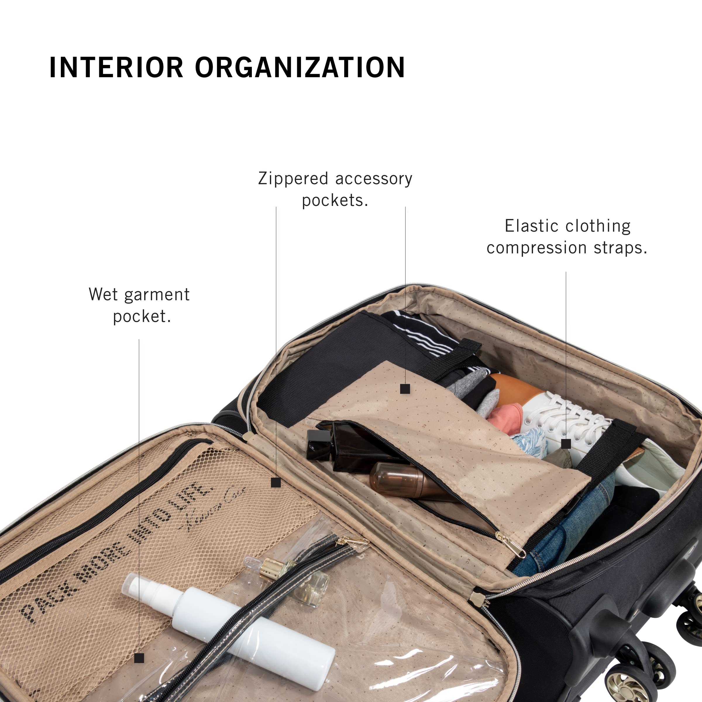 - Main compartment interior features organization pockets and garment restraints to hold your clothes in place.