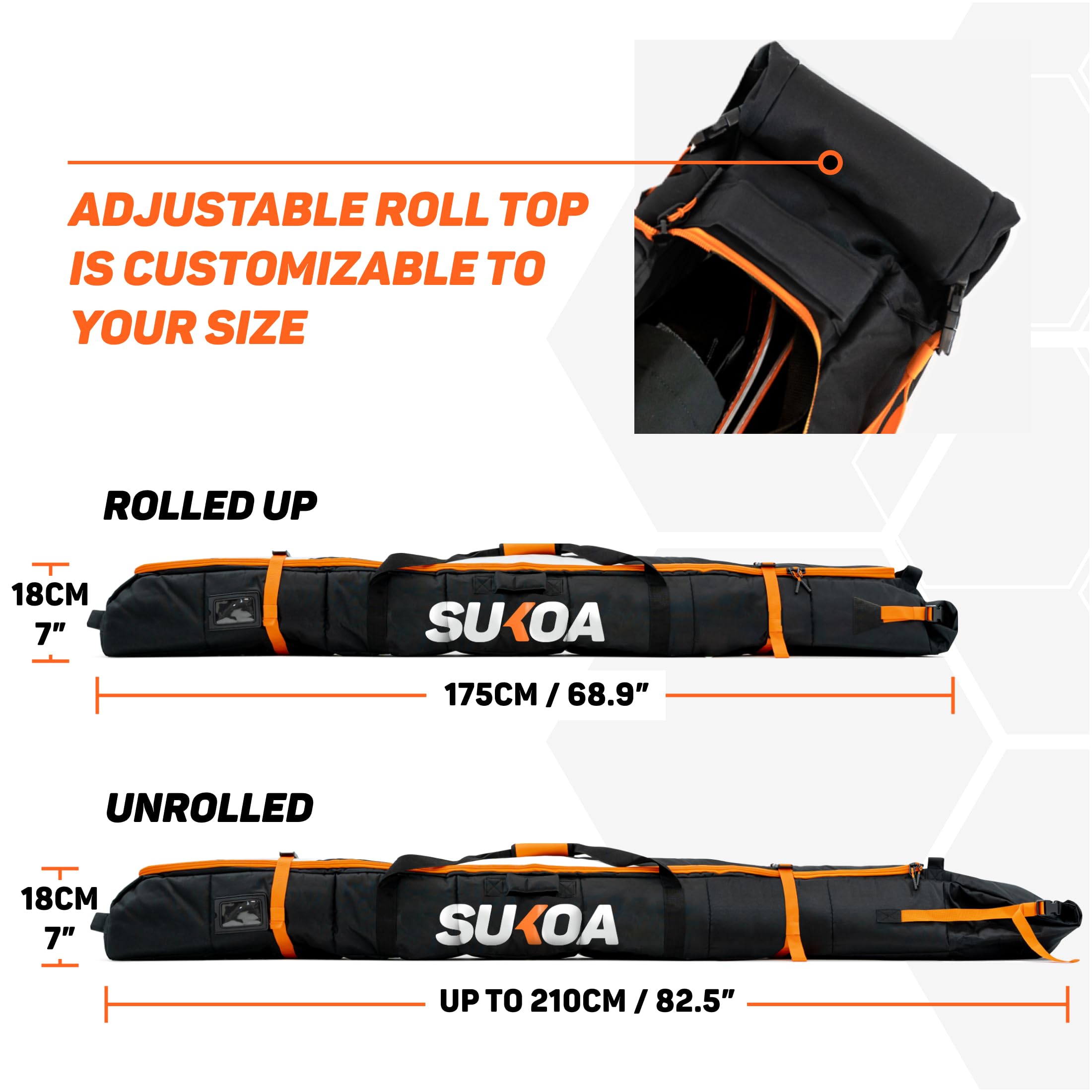 • Premium padded ski bag for air travel. One size fits up to 200cm skis with cushioned adjustable roll top. Safely secured with clips to hold firm. Length is adjustable, 177cm (rolled) to 210cm (unrolled). Purchase with confidence that you will always get the correct size.