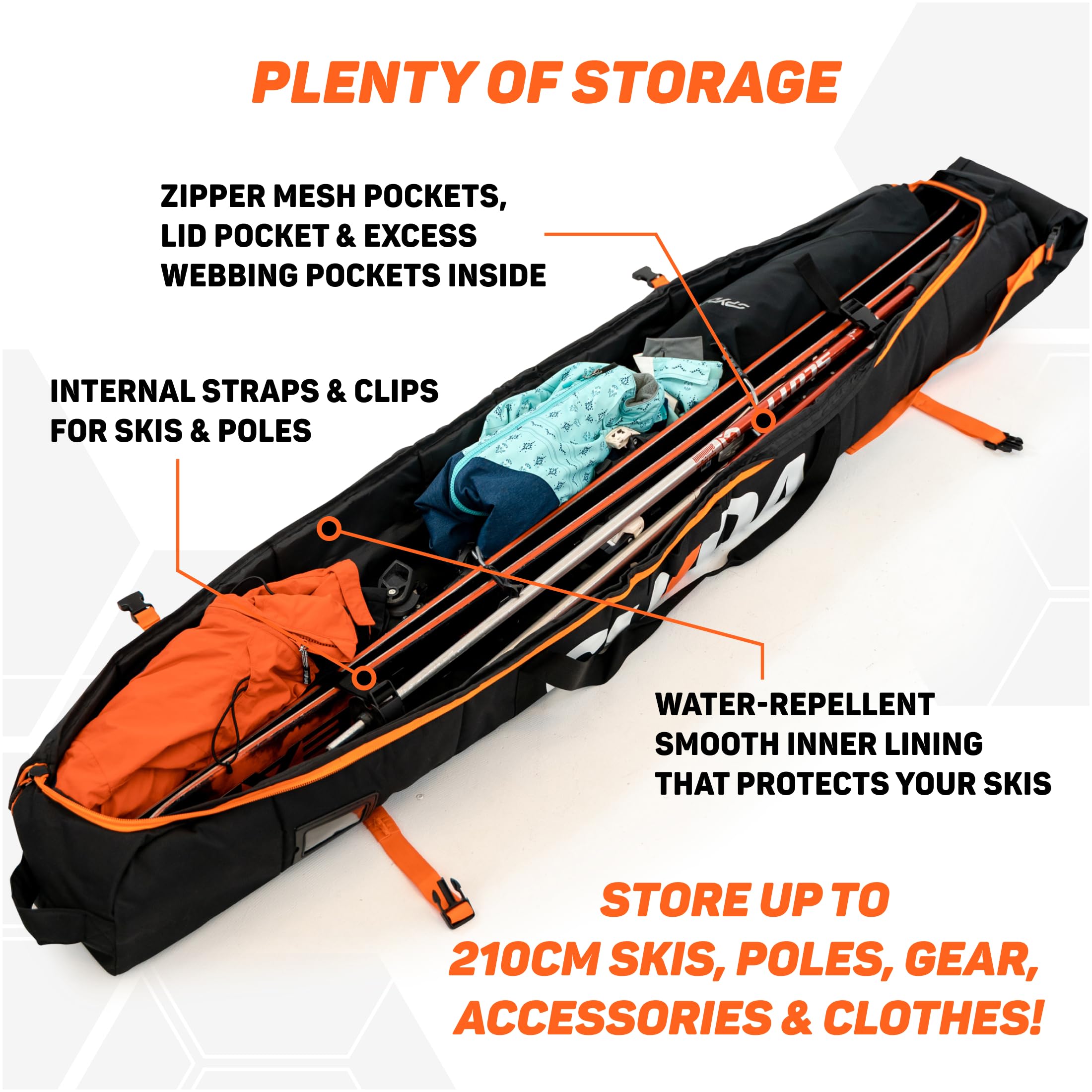• Single ski carry bags with internal webbing to hold skis. Create a stable spine for the bag that does not move so you can arrange all your other gear around it safely. Ski carrier travel case for cross country, downhill, ski clothes, gear, poles and accessories for men and women.