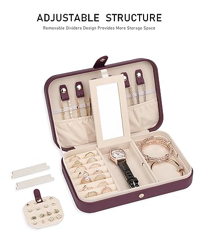 - [SMALL JEWELRY BOX] – The jewelry travel box has 6 button hooks (store necklaces, eardrop), 1 elastic band (to prevent jewelry from tangling or pouring out), 1 large storage pouch, 1 wide ring case, 1 Mirror, 1 removable earring tray, and 5 grids with dividers that you can remove to change the size of the grid.